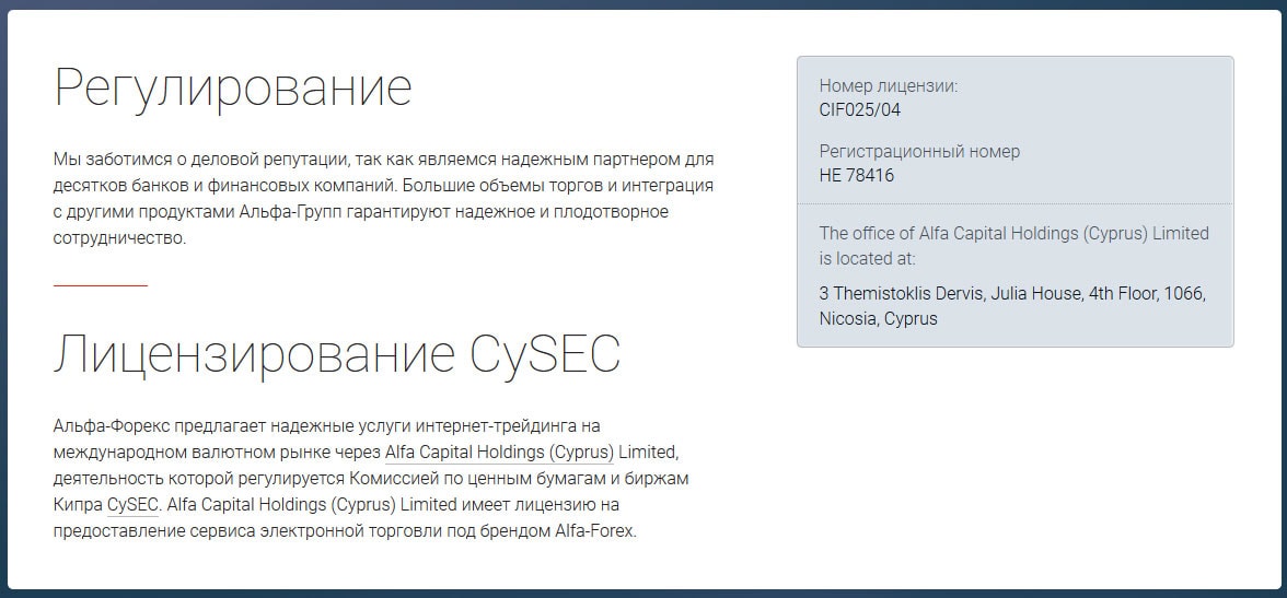 Сегодня, Альфа-Форекс регулируется CySEC по номеру HE 78416, лицензией CIF025/04.