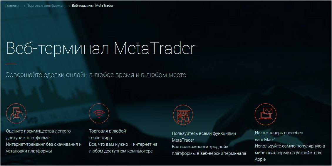 Веб терминал, предлагаемый брокером, имеет все те же преимущества, что и его «родная» платформа для компьютера. Котировки обновляются в реальном времени, имеется доступ к индикаторам, позволяющим производить технический анализ, к истории операций торговли, ну и конечно трейдер может совершать абсолютно любые торговые операции в онлайн режиме.