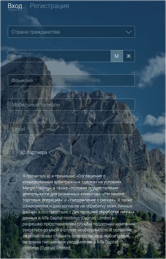 Итак, чтобы открыть счет для обучения торговле, вам необходимо зарегистрироваться в Альфа-Форекс. Схема регистрации та же, что и при открытии обычного торгового счета.