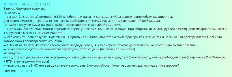 Однако при анализе обратной связи насторожило то, что отзывов о работе брокера Атон в совокупности не большое количество. А имеющиеся отзывы клиентов о брокере Атон на, создают у потенциальных пользователей неоднозначное впечатление: нельзя со стопроцентной уверенностью заявить, что у вас не возникнет серьезных проблем с рассматриваемым брокером при непосредственном инвестировании.