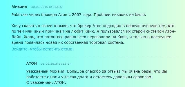 Большую часть положительных отзывов брокер Атон собирал, благодаря своей старой торговой платформе под названием «Атон-Лайн». Но спустя некоторое время организация перевела всех своих пользователей на другую систему Квик. Многим клиентам она не особо по нраву и признана неудобной.
