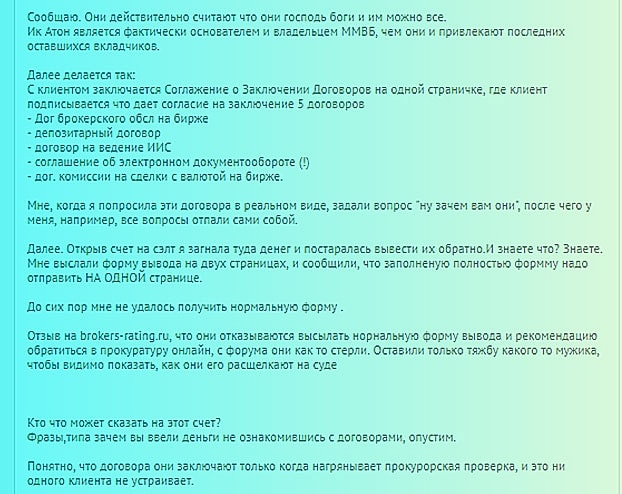 Но, скорее, это частный случай или всему виной нерасторопность отдельных сотрудников Атон. Возвращаясь к вопросу о действующей документации, отметим, что в одном из негативных обзоров было сказано о том, чтобы потенциальные клиенты инвестиционной компании Атон внимательно изучали клиентское соглашение. По мнению автора статьи, в нем имеется множество нестыковок с юридической точки зрения.