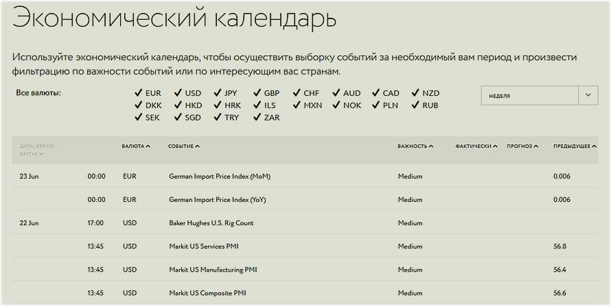 Для фундаментального анализа доступен экономический календарь. Есть обзоры от TradingCentral, WebTV, калькулятор трейдера и конвертер валют.
