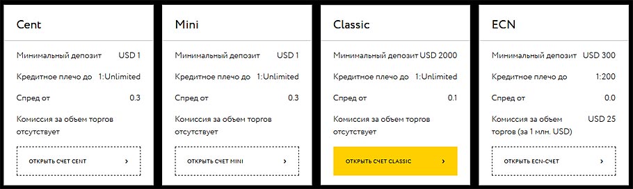 Для торговли доступно четыре типа счетов, а именно:
