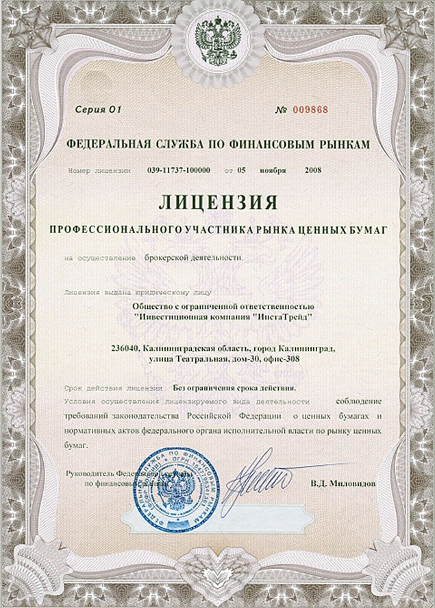 Деятельность же компании, осуществляется по лицензии ФСФР № 039-11739-010000. Также, компания имеет лицензию ФСФР № 1493 на осуществление деятельности в качестве биржевого посредника.Данная лицензия, дает право брокеру ИнстаТрейд предоставлять услуги на товарных биржах, где клиенты компании могут зарабатывать на бинарных опционах и при торговле фьючерсами.