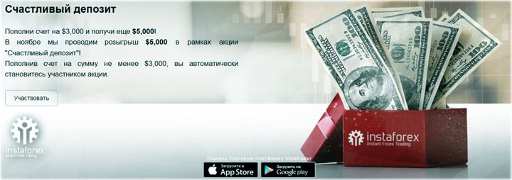 Следующий конкурс проводимый брокером ИнстаФорекс на реальных счетах, носит название «Счастливый депозит». Он является ежемесячным, а его приз разыгрывается среди трейдеров, которые пополнили торговый счет на 3 000$ и более.