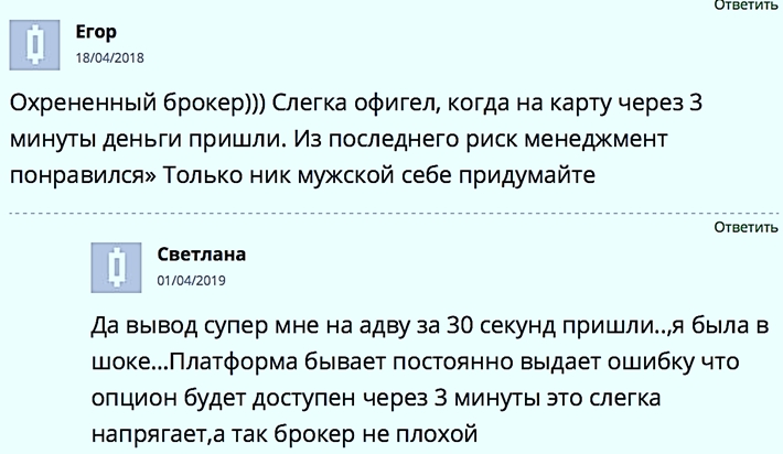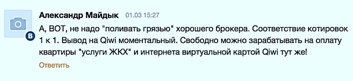 В данном отзыве, можно увидеть положительную реакцию на работу брокера: вывод денег происходит быстро, а также вся информация, указанная на официальном сайте, соответствует действительности.