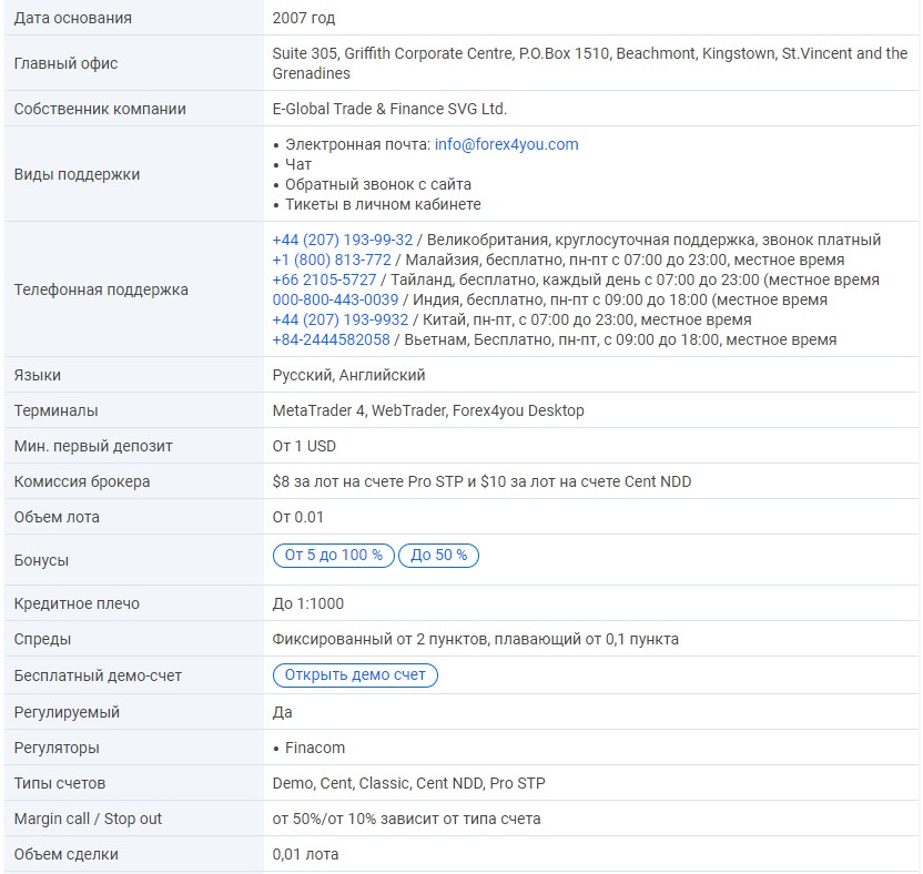Forex4you – это брокерская компания из бренда E-Global Trade & Finance Group, которая начала свою деятельность в 2007 году.