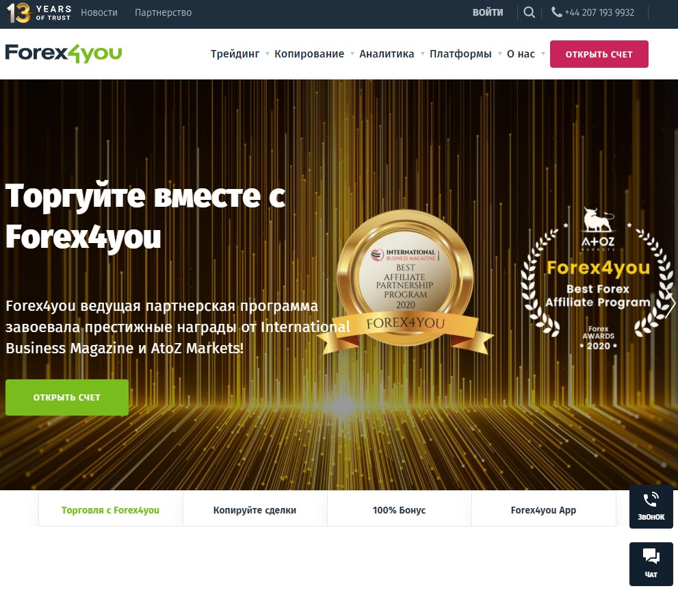 ТОП 4: Forex4you — Форекс дилер, позволяющий работать с демо счётом и терминалами MT 4 и 5