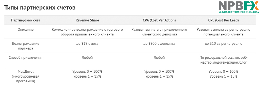Получать прибыль можно по партнерской программе, привлекая новых клиентов в NPBFX. В компании доступно три типа вознаграждений.