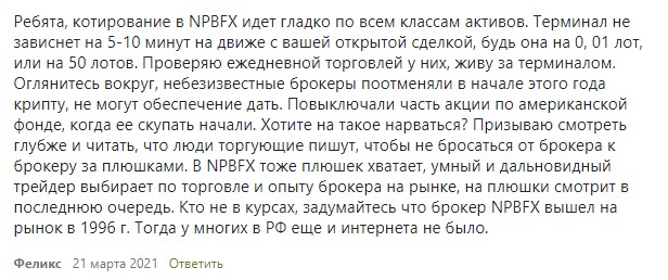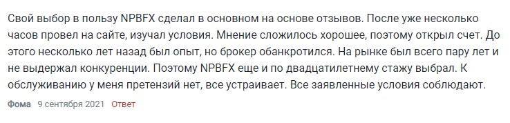 Негативных отзывов очень мало, многие трейдеры пишут свои пожелания, например, некоторым клиентам кажется, что в компании не хватает ECN-счетов или разнообразия криптовалютных инструментов, другие отмечают периодическую задержку в ответах техподдержки. Конечно, все это не является критичным. Главное, что компания дает качественные условия для торговли и выводит клиентам заработанную ими прибыль. Именно об этом 14 сентября 2021 года написал трейдер, торгующий в NPBFX:
