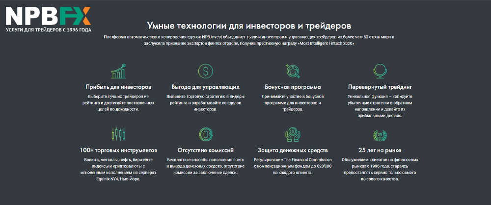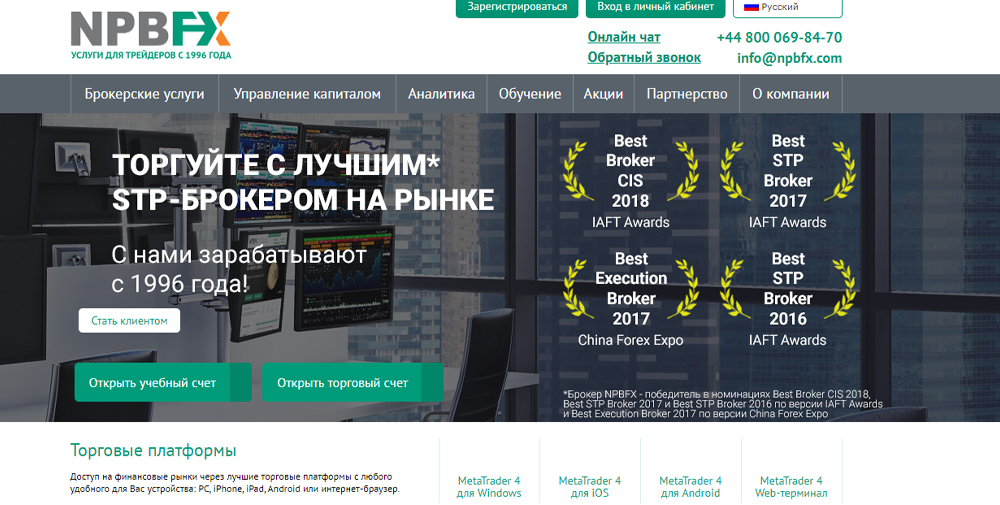 Брокерская компания NPBFX имеет более чем 25-летнюю историю, отличается выгодными условиями для трейдинга и инвестирования. Входит в топ наиболее надежных брокеров в русскоязычном сегменте индустрии, имеет отраслевые награды в престижных премиях. Сделки обрабатываются при помощи безопасной и мощной технологии STP.