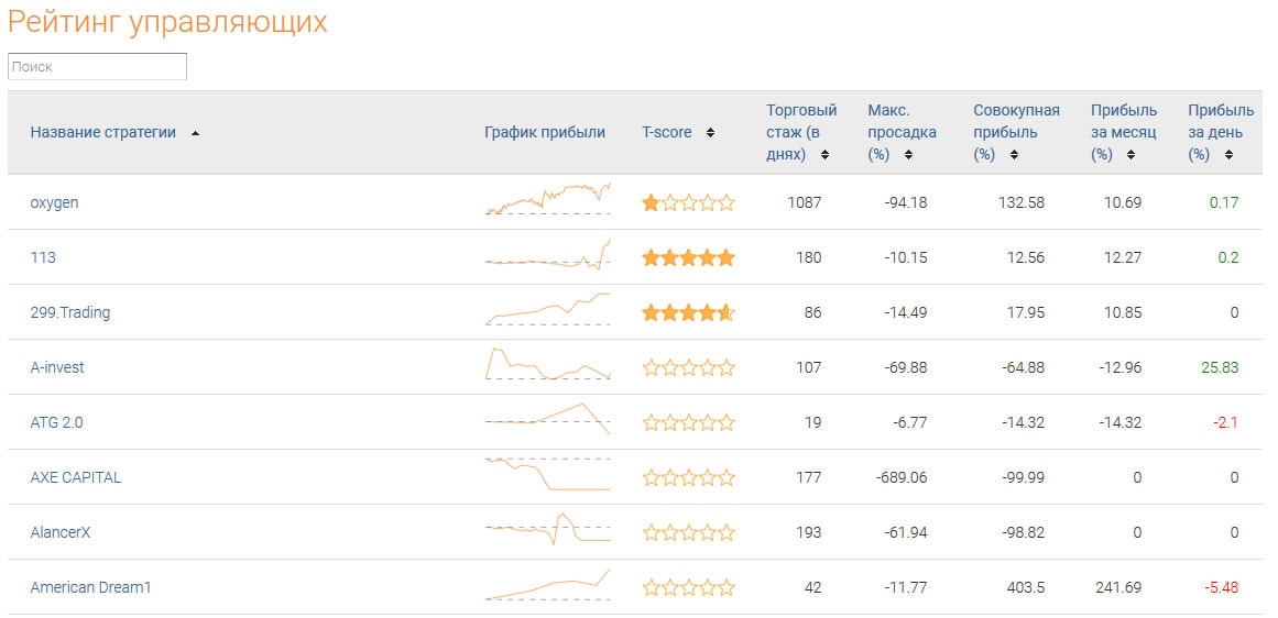 Отметим, что управляющие никак не связаны напрямую с компанией, а выступают в роли самостоятельных трейдеров. Также необходимо сказать, что брокер разработал специальный показатель «T-score», дающий возможность ранжировать стратегии управляющих по совокупности целого ряда показателей, для максимально объективного выбора.