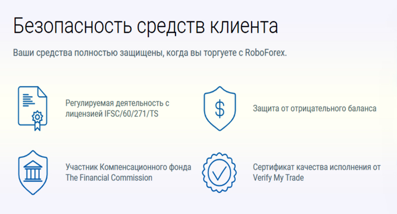 Персональная информация и счета трейдеров защищаются с помощью верификации клиентов и двухфакторной аутентификации. Компания RoboForex обязуется поддерживать баланс на счетах клиентов положительным, при этом без взимания компенсаций.