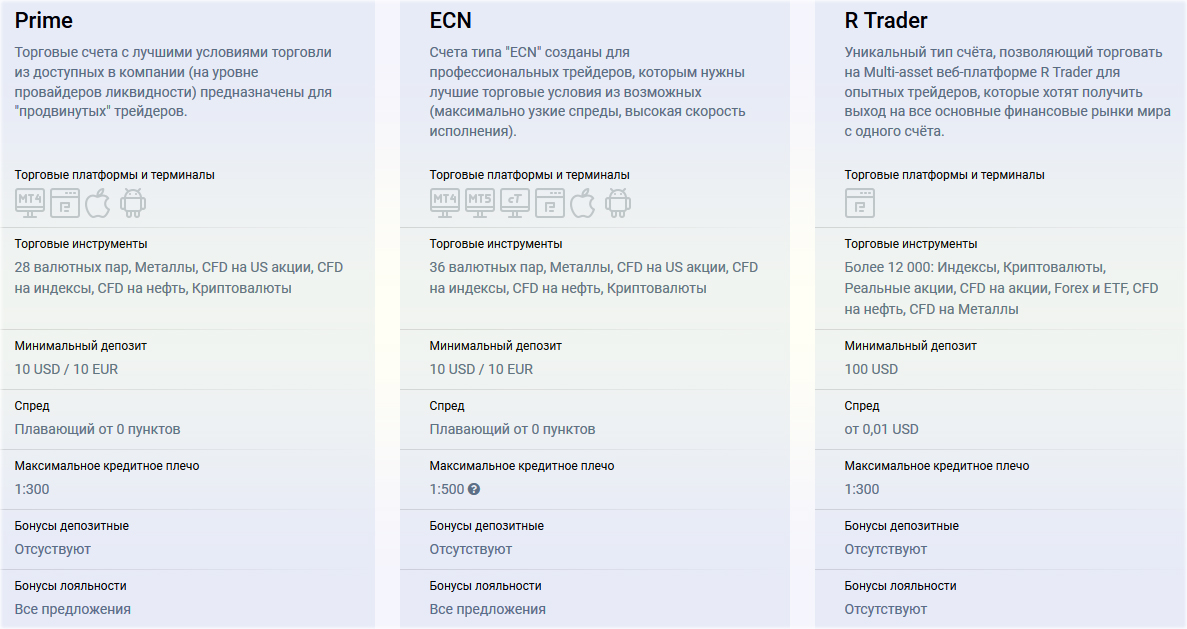 - Если клиент хочет выйти с одного аккаунта на все известные международные рынки, то он использует счёт R Trader. В своём арсенале он имеет более 11700 торговых инструментов. Минимальным депозитом является 100 долларов.