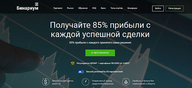 Услуги торговли бинарными опционами брокером Binarium начали действовать с 2012 года. Компания предоставляет трейдеру торговую платформу для заработка до 90% от суммы сделки. В основном посредник помогает трейдерам-новичкам, поэтому интерфейс сайта и мобильного приложения не имеет сложных наименований и подходит для старта.