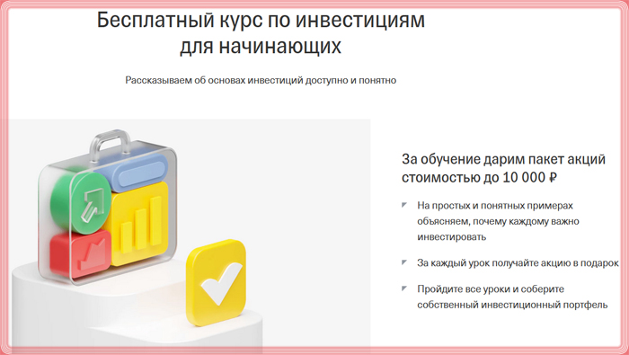 Открыл счёт у брокера-банка Тинькофф. У него небольшие комиссии и бесплатное обучение по инвестициям. Пройдя уроки, получил в подарок инвестиционный портфель с акциями.