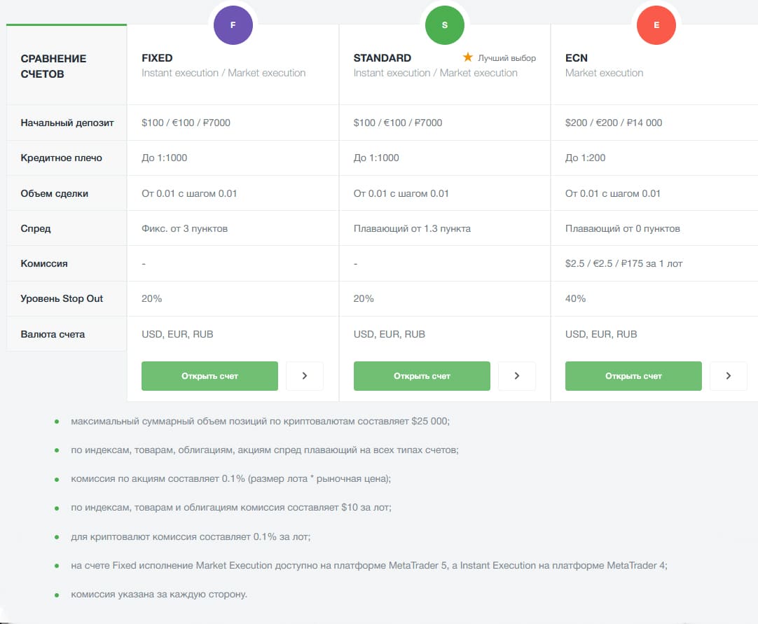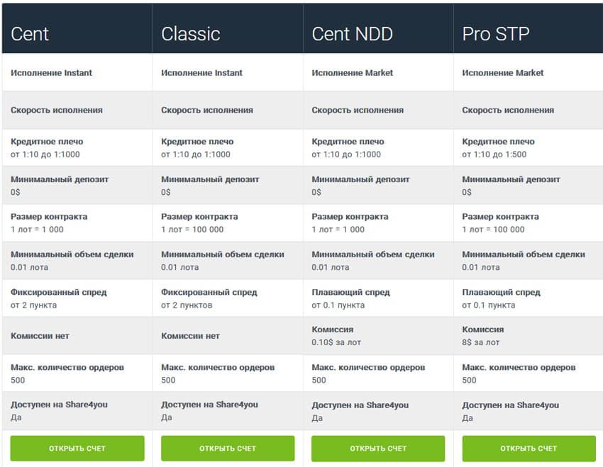 В таблице сравнение доступных для трейдинга счетов: