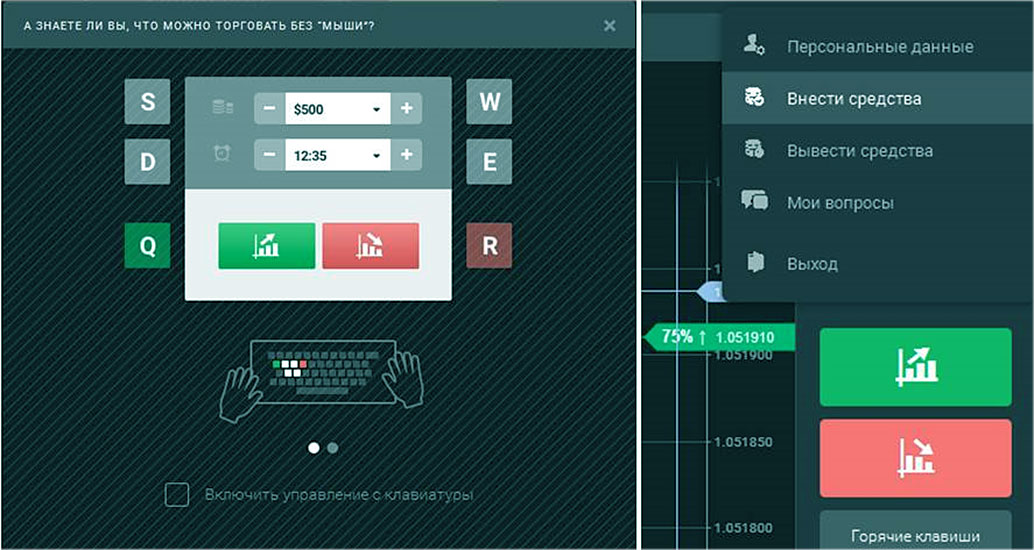 Вся торговая платформа, размещается на экране при торгах на смартфонах, что очень удобно, имеет встроенный интерфейс с доступом в личный аккаунт и постоянного доступа «горячих клавиш» для скальпинга опционами, с периодичностью от 30 секунд.