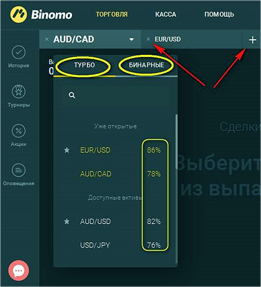 Тут же, в появившемся списке, отображается информация по проценту выплаты прибыли, плюс к этому Вам доступен выбор типа экспирации опциона – бинарный (с часовым истечением) или турбо (начиная с нескольких секунд).
