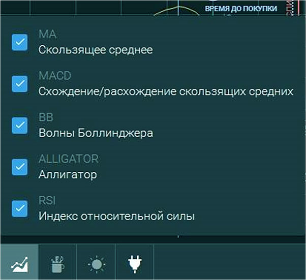 Выпадающий список, (5 наименований) из оптимально скомпонованных технических индикаторов, подобранных для наиболее распространенных опционных стратегий. Выбираются они путем простановки галочек в навигационном окне.