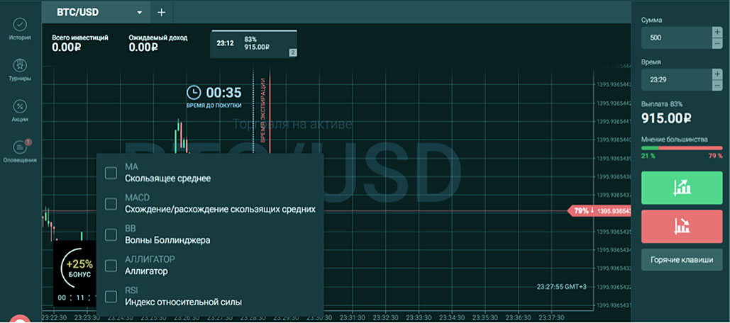 После регистрации в Binomo, Вам в личном кабинете, будет доступна обновленная платформа. На момент создания обзора в платформе имеются такой набор инструментов: