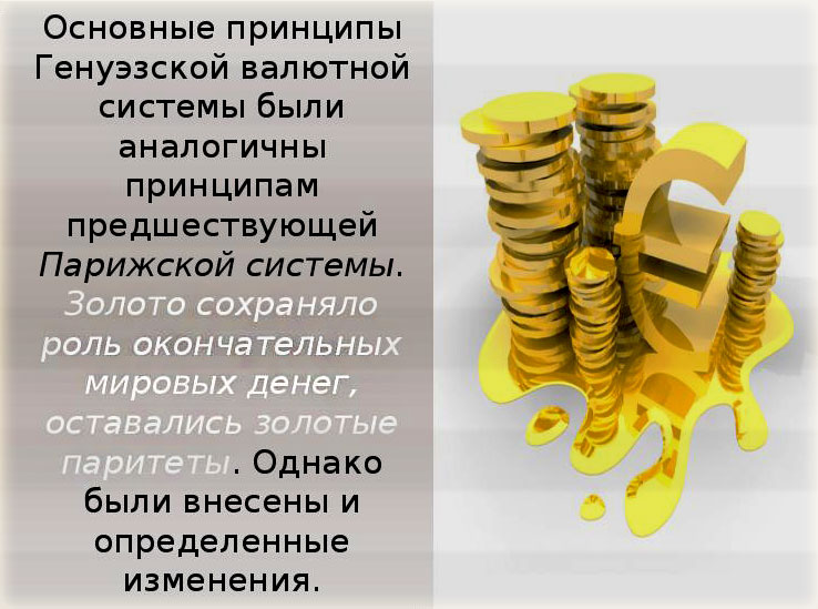 Был внедрён золотодевизный стандарт, в основе которого были резервные валюты – доллар, фунт стерлингов и золото.