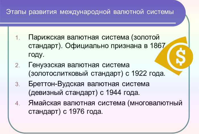 Курсовое соотношение валют и их конвертация стали осуществляться на основе зафиксированных валютных паритетов. Был введен режим фиксированных или точных валютных курсов.