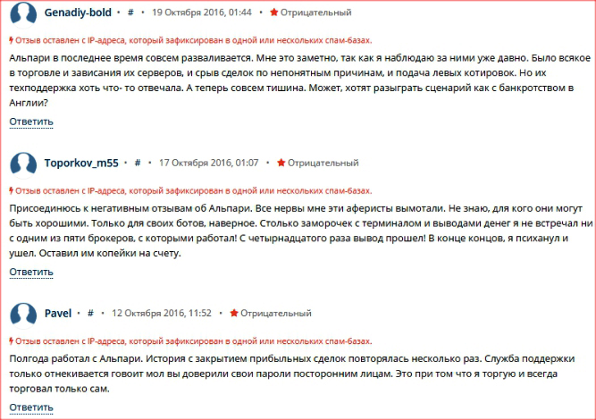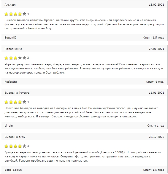 Eugen80 называет Альпари «неплохим брокером», но предлагает обратить внимание на решение вопроса со страховкой средств. FedorStu жалуется, что «убрали пополнение с карты, киви, яндекс» и спрашивает, как же теперь пополнять. denchinus также рассказывает о своих попытках вывода денег на кошелек webmoney, когда пришлось общаться с поддержкой, но после все «пришло моментально». Vickus1 оценивает условия работы с Альпари для трейдера, замечая, что инвесторы здесь легко найдут тебя сами. BalAlex отмечает, что «главное преимущество — то, что выводят деньги», а все остальное сопоставимо с другими брокерами. Владимир утверждает, что «Альпари — надежная контора».Трейдеры упрекают Альпари в том, что это «кухня», сделки здесь не выходят на рынок.
