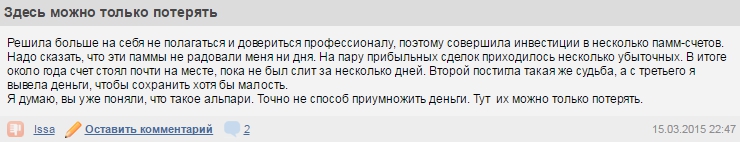 И все-таки почему столько негатива? Давно замечено, что люди гораздо с большей охотой жалуются, чем хвалят. Это психология. Если все нормально, например, инвестиции в ПАММ счета на Альпари приносят доход, то никому и в голову не приходит написать об этом публично.