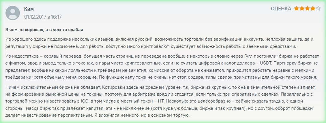 Среди недостатков трейдеры отмечают сложную систему верификации, ограничения на депозит и пары с фиатом, отсутствие возможности торговли на фьючерсы, языковые ограничения в технической поддержке и ограничение количества валют при маржинальной торговле.