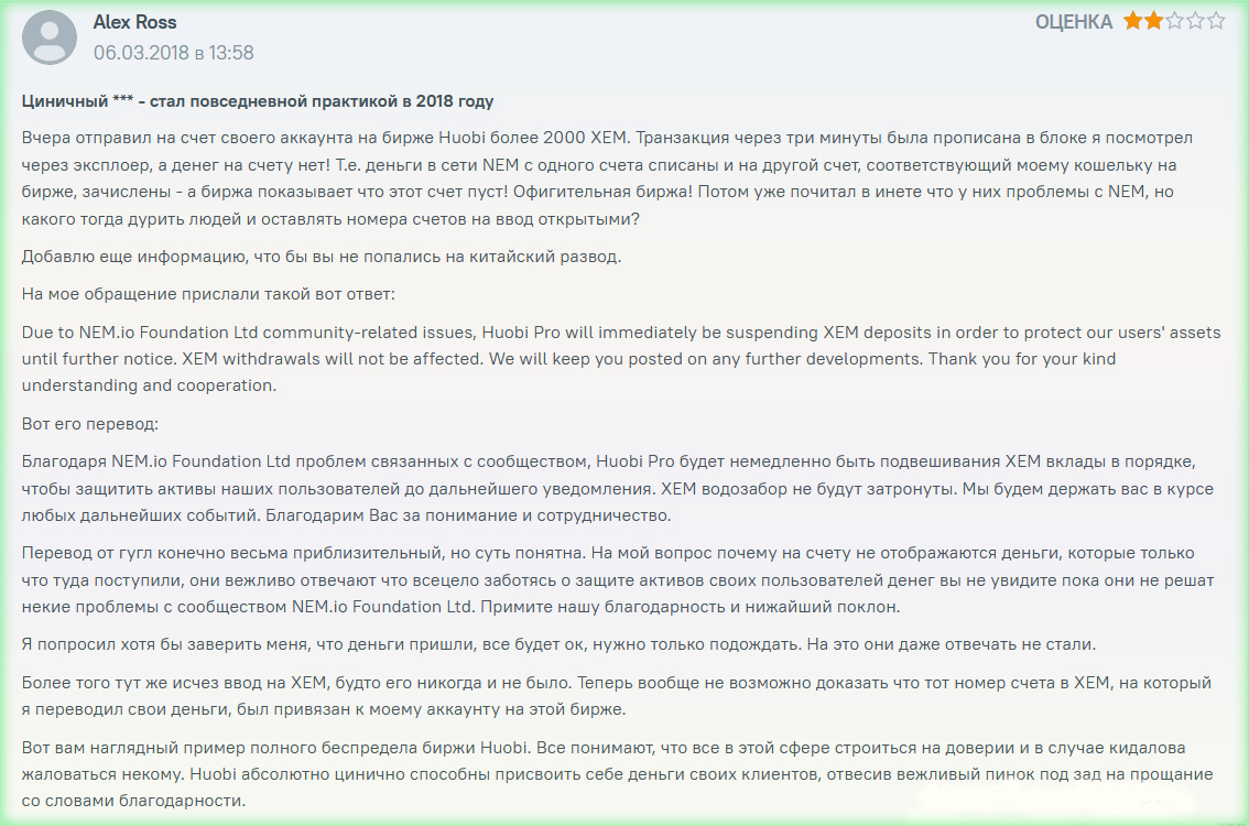 Высокий рейтинг доверия и постоянно увеличивающиеся показатели торговых объемов характеризуют биржу как надежный и развивающийся ресурс. Единственной сложностью, с которой могут столкнуться пользователи, является периодическое вмешательство китайского правительства в работу с цифровыми валютами.