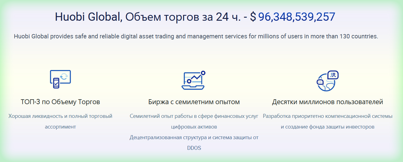 Huobi Global – надежная биржа не только для трейдеров, но и для инвесторов. Главным преимуществом платформы является высокий рейтинг по общему торговому объему, что говорит об удобстве и безопасности.