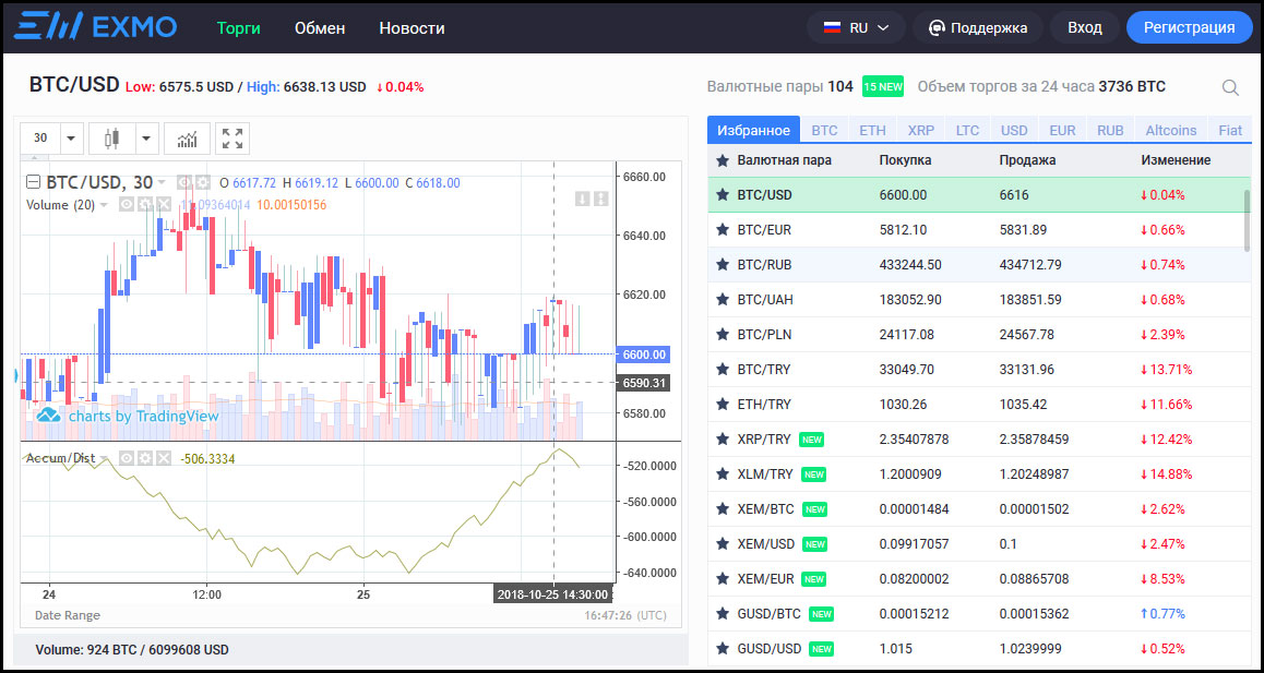 торговая площадка функционирует на международном уровне и базируется на территории Великобритании; биржа Эксмо отличается повышенной надежностью и считается одной из самых безопасных площадок для торговли криптой. За 5 лет к Exmo не было предъявлено каких-либо серьезных претензий; ежедневно данный сервис посещают около миллиона активных пользователей. Суточный оборот средств зачастую переваливает за полмиллиона; русскоязычный интерфейс для начинающих трейдеров играет важную роль. Сам интерфейс сайта устроен таким образом, что в нем без особого труда можно разобраться как торговать на бирже Эксмо; также есть возможность вывести имеющуюся криптовалюту вывести посредством платежных систем Яндекс.Денег, QIWI или же на счет российских операторов; на данной платформе криптовалюта приобретается по наиболее выгодным курсам, если сравнивать предложения других сервисов; высокая скорость обработки ордеров позволяет эффективно торговать на бирже Эксмо. Данный сервис крайне эффективен при обмене девяти видами криптовалют.Если вы имеете опыт правильной торговли криптовалютой на Exmo, то вам для начала необходимо зарегистрироваться на торговой площади и пополнить баланс своего кошелька.