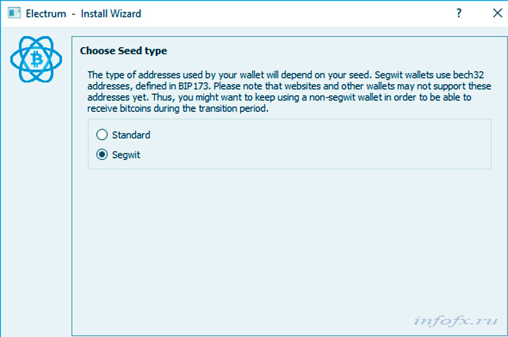 При выборе типа хранилища советуем выбрать Segwit, так как именно этот вариант обладает рядом преимуществ.