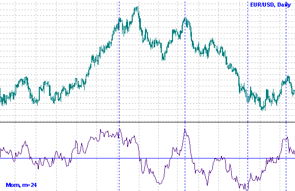 Смена тренда осциллятора момент, как правило, указывает на ослабление главной ценовой тенденции, а пересечение осциллятором нулевой границы, сообщает о смене тенденции.
