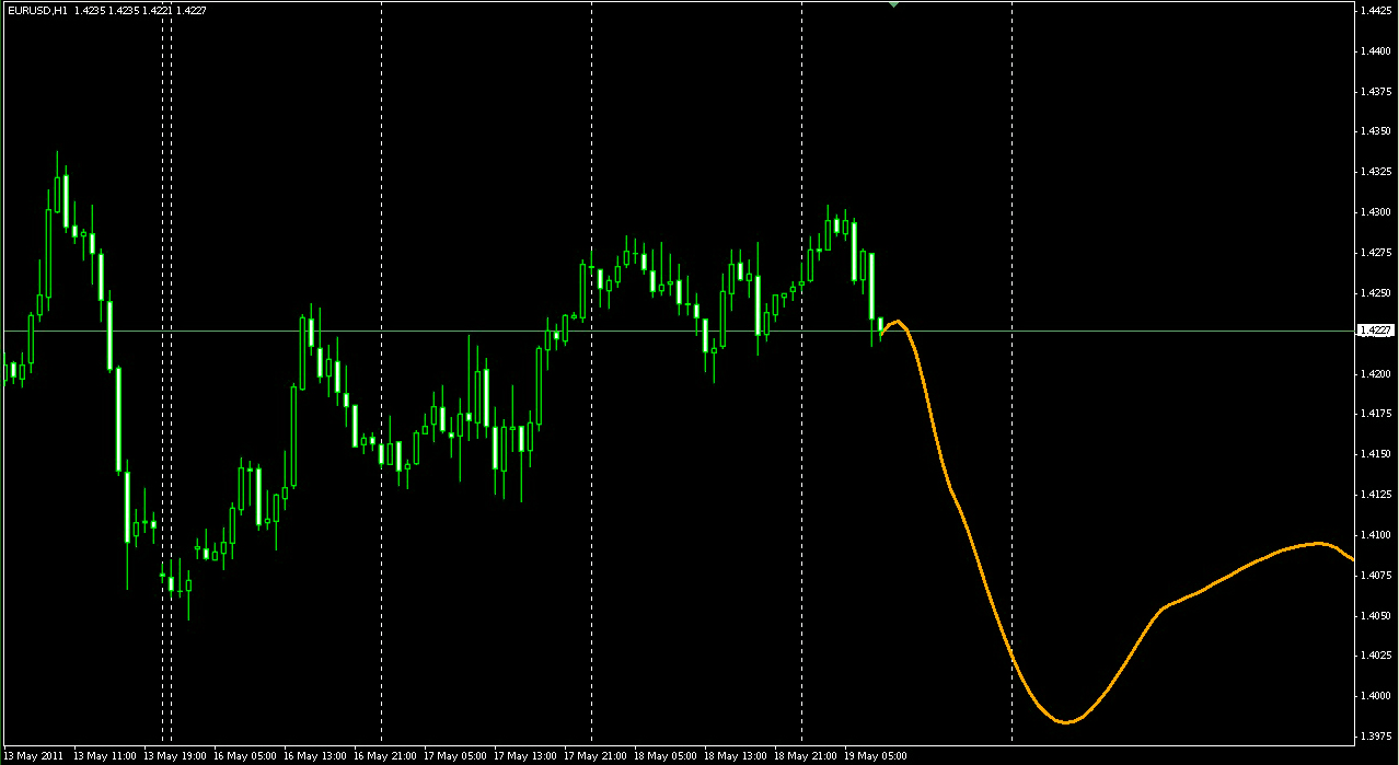 Данный индикатор, рисует прогнозируемое движение стоимости валюты на Форекс на базе последовательно расчет волн Фурье. Его можно отнести к типу опережающих индикаторов. Он рисует на графике линии оранжевого цвета, которые показывают предположительное движение стоимости в будущем.