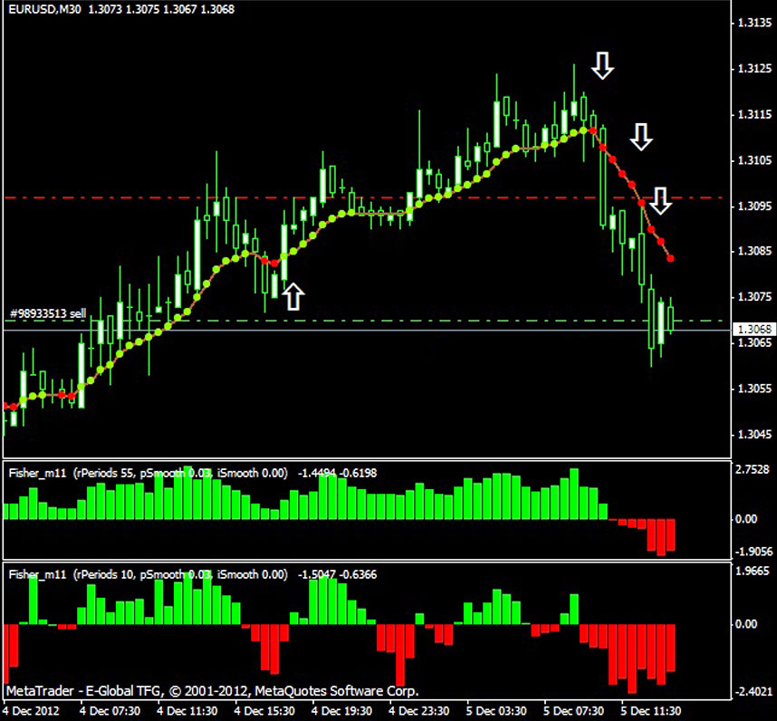 Закрывается сделка после того, как наш индикатор Fisher с периодичностью 55 изменит цвет, что будет сигналом о том, что долгосрочный тренд делает разворот. Для вхождения в сделку на продажу, все условия должны быть зеркально симметричны условиям на покупку.