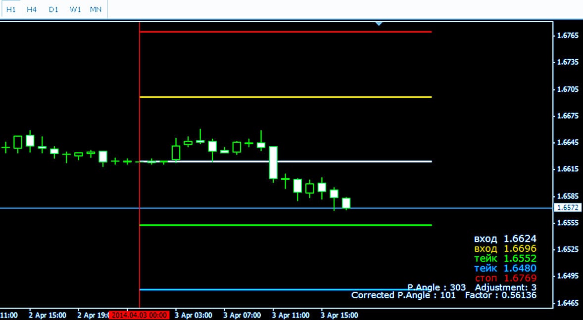 Как уже говорилось, индикатор Форекс Гойлер в своей работе использует методику Ганна, позволяющую один раз в течение суток получать торговые сигналы. Помимо этого, индикатор Форекс Гойлер указывает на наиболее приемлемые уровни Stop и Take, для открываемой трейдером позиции.