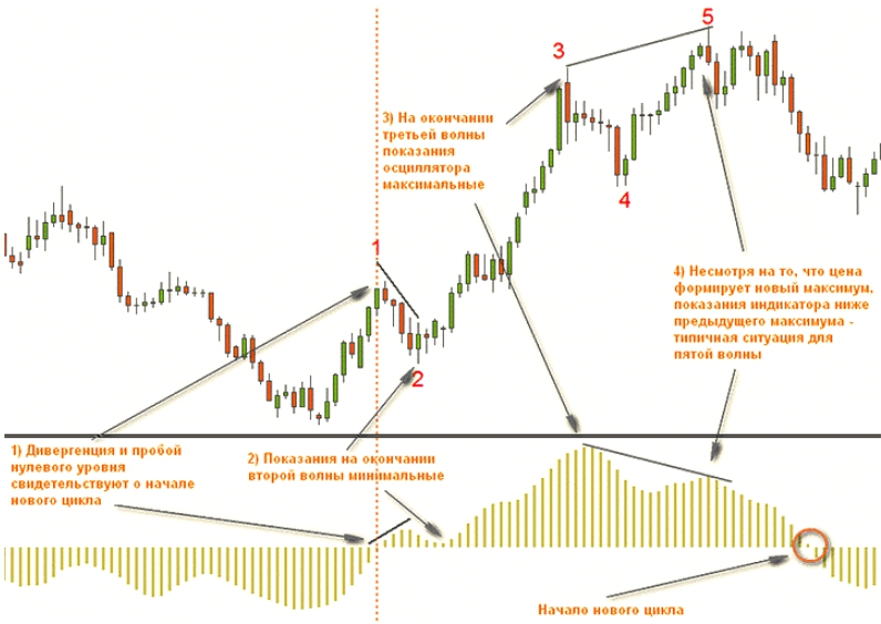 Согласитесь, что данный инструмент очень напоминает индикатор MACD. И сигналы он даёт практически такие же. Стоит отметить, что это более упрощенная форма индикатора волн Эллиотта, так как с помощью осциллятора можно увидеть тренды рынка, их смену, а также с помощью дивергенций – начало новых циклов.