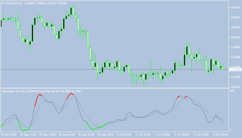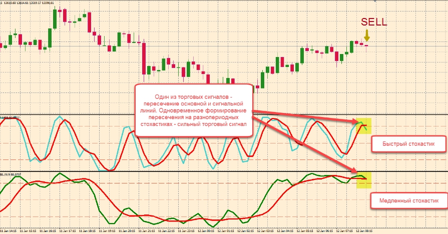 Как видите, быстрый стохастический индикатор на развороте цены сигнализирует трейдеру красным и салатовым цветом. Это очень удобно.