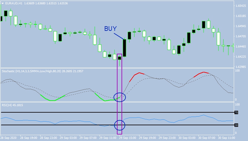 Наблюдаем, как более быстрый стохастик осциллятора (самая тонкая красная линия) достиг зоны перепроданности, но не пробил её сверху вниз, после чего красный цвет сменился на зелёный. Видим, медвежья свеча, почти поглощена бычьей свечкой. Однако нам этого недостаточно для открытия длинной позиции. Поэтому мы ждем, как закроется следующая свеча и она закрывается зелёной. К тому же наблюдается пересечение двух линий осциллятора. Это и есть сигнал на открытие сделки BUY.