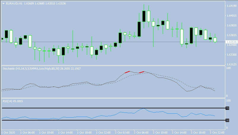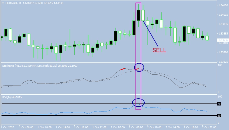 Кроме того, стохастический индикатор обеспечивает отличное понимание времени входа. Когда обе линии находятся над линией перекупленности (80), а линия% K пересекает пунктирную линию% D, это можно рассматривать как возможный сигнал входа для открытия короткой позиции и наоборот, когда линия% K пересекает линию% D. линия, когда обе линии ниже линии перепроданности (20).