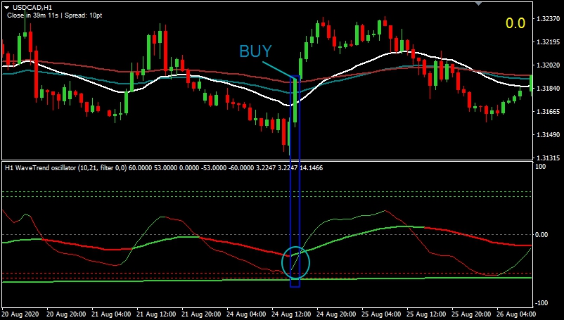 Цена считается «перекупленной», когда две движущиеся линии пробивают снизу вверх верхние горизонтальные линии, и «перепроданная» — когда линии пробивают сверху вниз нижние горизонтальные линии.