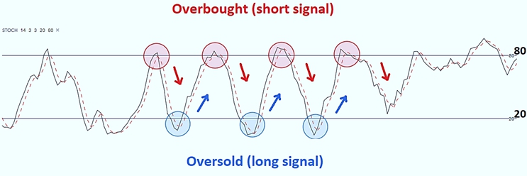 Кроме того, трейдеры не должны слепо торговать, полагаясь только на условия перекупленности/перепроданности. Трейдерам необходимо понимать направление общей тенденции и соответствующим образом фильтровать будущие сделки. Например, глядя на график USD/SGD ниже, поскольку общий тренд нисходящий, трейдеры должны искать короткие сигналы входа только на уровнях перекупленности (80). Только когда тренд разворачивается или торговый диапазон хорошо установлен, трейдеры должны искать длинные входы в условиях перепроданности (20).
