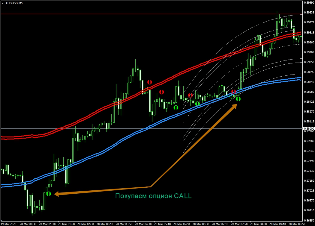 - если же свеча формируется выше средней скользящей ВВ, тогда рассматриваем только покупку опциона CALL (продажи).