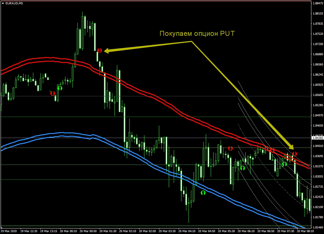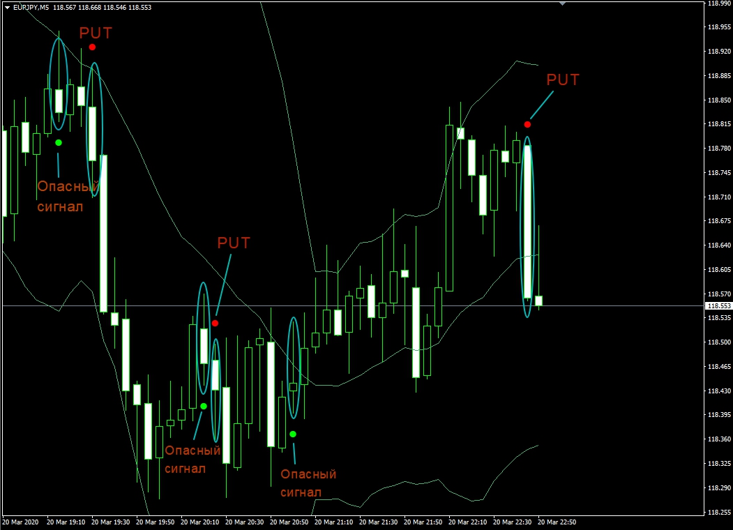 - если свеча формируется ниже средней скользящей ВВ, в таком случае рассматриваем исключительно покупку опциона PUT (продажи);