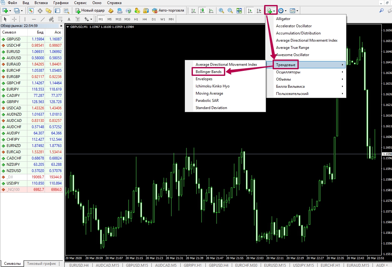 Первый индикатор, который нам нужно нанести на график в MetaTrader 4, предварительно выбрав надежного брокера для опционного трейдинга, Bollinger Bands [далее ВВ – ред.]. Чтобы сэкономить ваше время мы рекомендуем самого надежного Форекс-брокера — Alpari. На его платформе МТ4 мы и будем работать. Но сделки открывать мы будем на платформе брокера соответственно бинарных опционов. Для его выбора советуем вам посмотреть ЭТОТ РЕЙТИНГ.