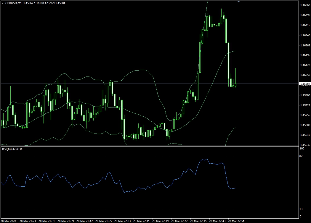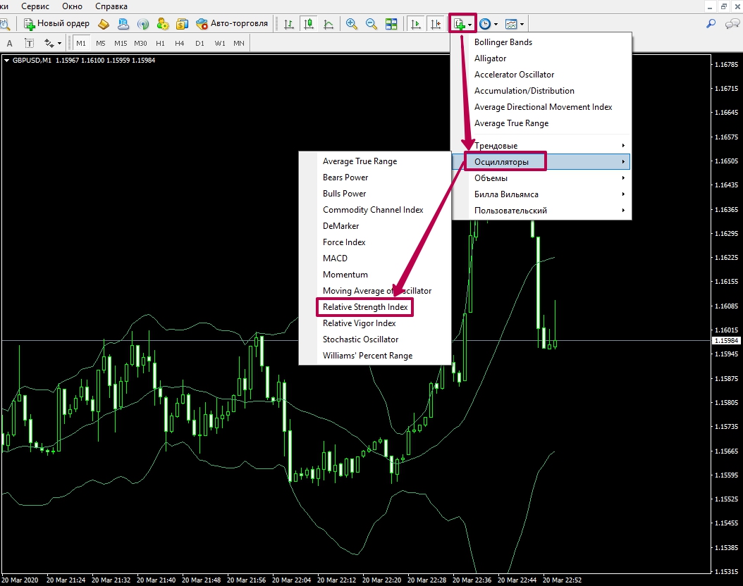 Особенность применения данного инструмента будет заключаться в том, что когда цена приблизится к верхней или нижней границе канала индикатора ВВ, есть высокая вероятность отбоя в противоположную сторону. Далее нужно разобраться, когда покупать опционы CALL/PUT. Для того чтобы получить более точные сигналы, мы должны добавить на график ещё один фильтр — индикатор RSI.
