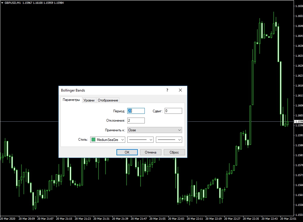 После клика по индикатору BB, появится окно со стандартными настройками: